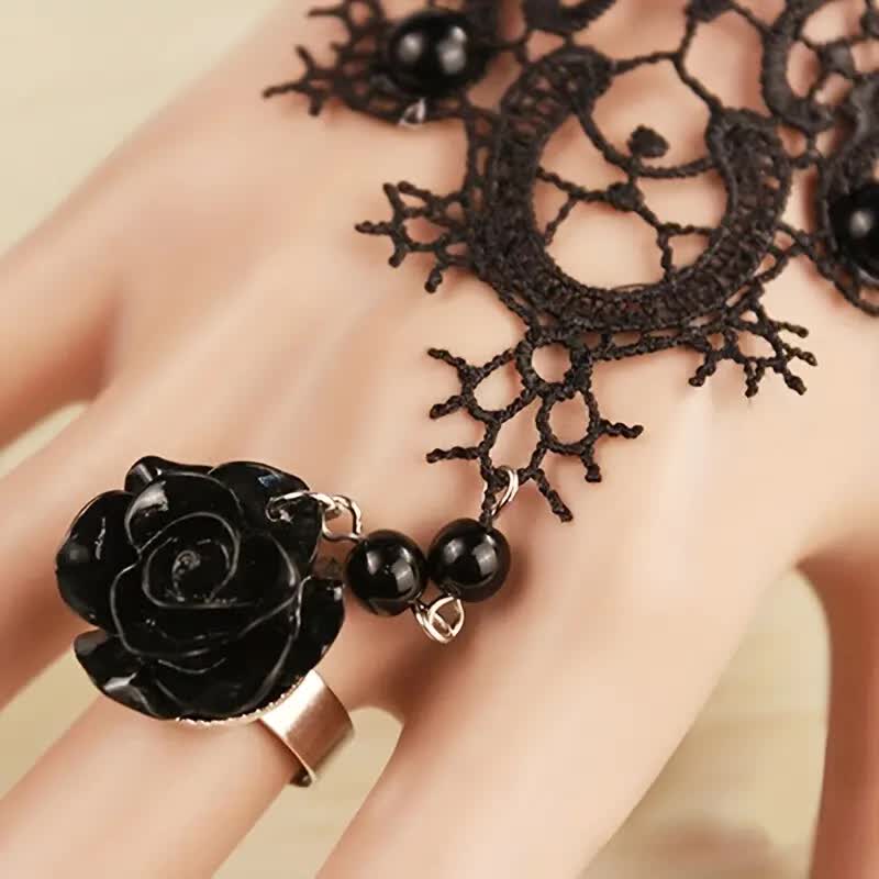 eleganter fingerloser Spitzenhandschuh mit schwarzer Rose in schwarz mit Fingerring
